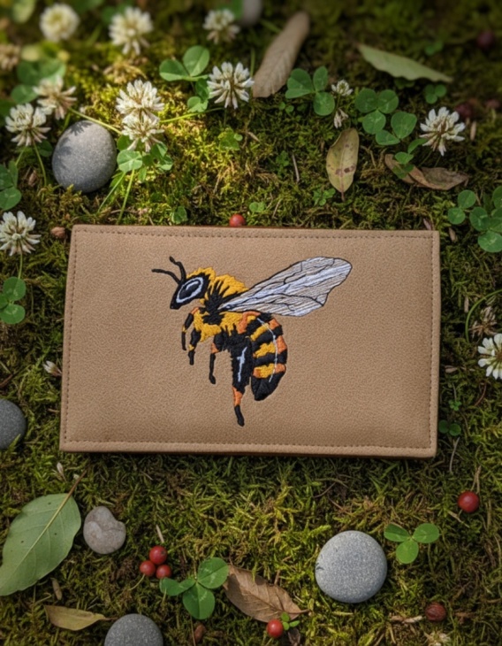 Haftowany portfel wykonany z impregnowanego papieru i skaju. Jest 100% wegański.